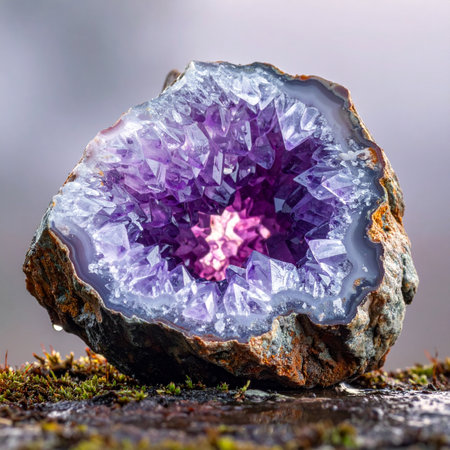A stunning amethyst geode rests on a bed of fresh green moss, its raw exterior split open to reveal a breathtaking interior of vibrant purple crystals.
