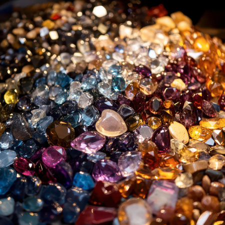 A stunning close-up view of an array of colorful precious gems and stones reflecting light. The diverse shapes and vibrant colors create a mesmerizing display, perfect for showcasing beauty in nature.