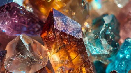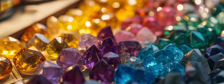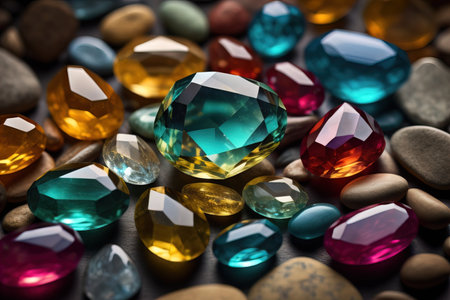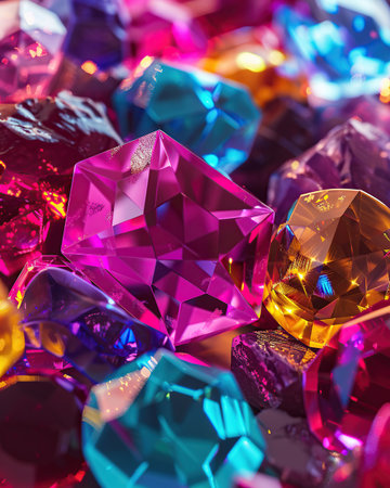 This stunning close-up image showcases a collection of vibrant gemstones in various colors, reflecting light and enhancing the artistic appeal for decorations.