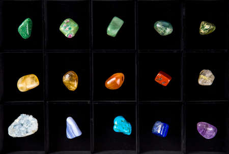 Variety of colorful semi precious stones crystals in organizer box sorted by color isolated on black.