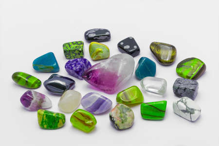 A pile of smooth, polished colored stones in various shades of blue, green, and red, glistening under soft light.