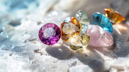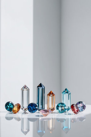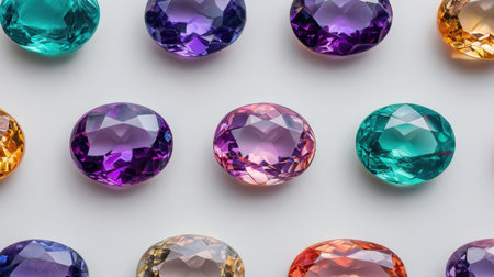 Vibrant collection of gemstones showcased in various shapes and colors, reflecting light beautifully on a neutral surface, ideal for design projects.