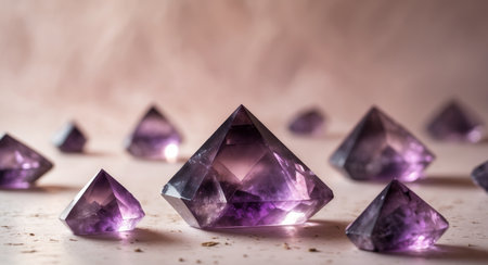 AI Generated. Purple crystals on soft pink background with natural light reflections and textures