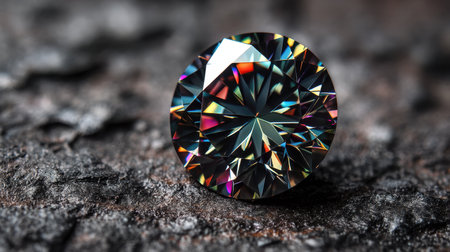 This image showcases a stunning multi-colored cut diamond resting on a dark rustic surface. The intricate facets create mesmerizing reflections and sparkle.