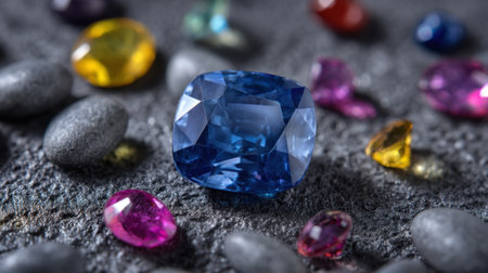 This captivating photo showcases a dazzling blue gemstone among an array of colorful minerals and smooth stones, creating an artistic composition.