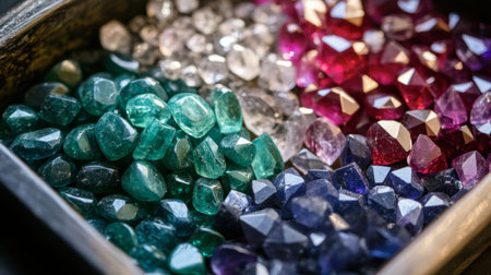 Diamonds and emeralds, crystals and rubies, raw gemstones for jewelry