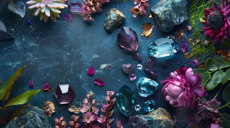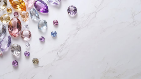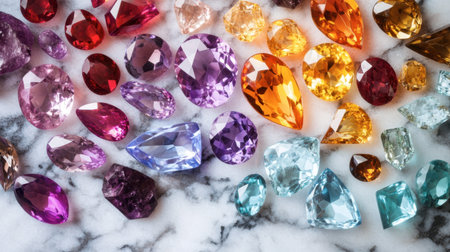 A stunning array of colorful gemstones is scattered across a smooth marble surface, creating an elegant and luxurious background perfect for design projects and decor.