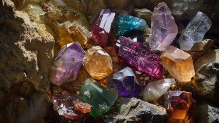 A diverse array of colorful crystals rests atop a textured pile of rocks, showcasing intricate details and vibrant hues. this composition highlights natural beauty, making it ideal for geology enthusiasts, collectors, and design inspiration.