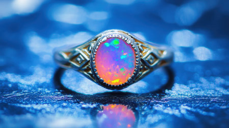 A stunning opal ring reflecting various colors of light, displayed on a reflective surface.