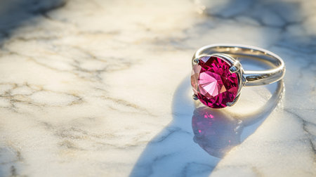 This stunning silver ring features a vibrant pink gemstone, perfectly accentuated by soft shadows on a polished marble surface, creating an enchanting effect.
