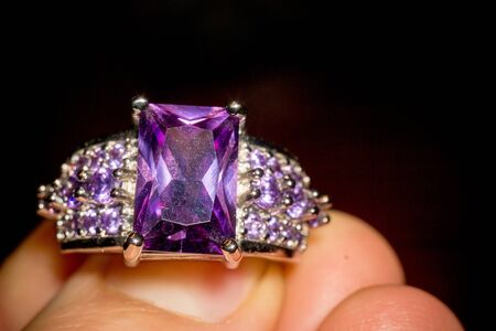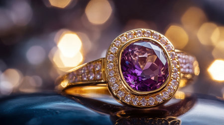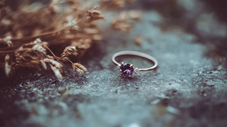 This beautiful image captures a detailed view of a purple gemstone ring resting on a sparkling stone surface, highlighting its intricate design and luxurious appeal.