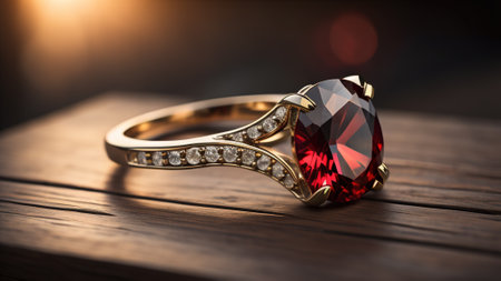 Jewelry ring with red gemstone on a dark background.