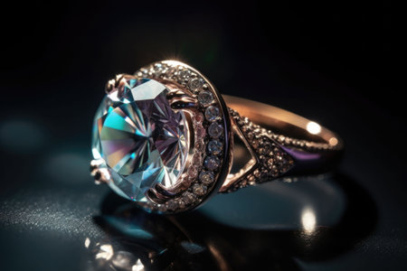 A captivating close-up of a round diamond ring featuring stunning colorful reflections, showcasing elegance and luxury against a shimmering background. Perfect for jewelry enthusiasts.
