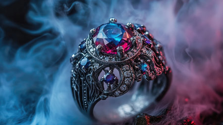 This captivating vintage ring features a colorful gemstone, intricately designed with exquisite detailing. Set against a dark smoky backdrop, it highlights elegance and artistry in jewelry design.