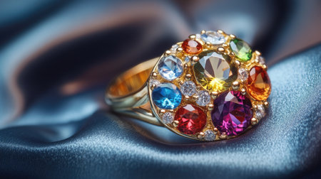 This exquisite gemstone ring features a stunning array of colorful stones set against a luxe silky blue fabric. Perfect for fashion enthusiasts.