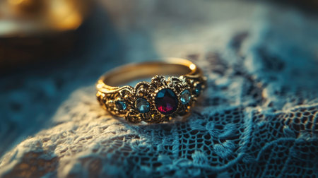 A stunning vintage gold ring featuring a red gemstone, intricately designed, resting on delicate lace. Perfect for showcasing elegance and beauty.