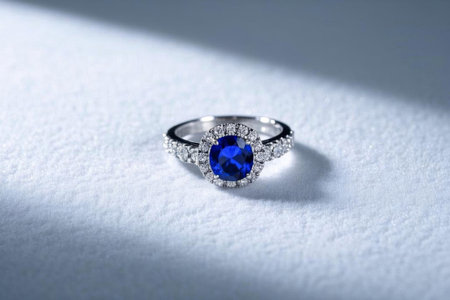 stunning sapphire ring captures attention its deep blue hue surrounded glimmering diamonds showcasing intricate details in sophisticated ambient light.