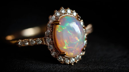 This stunning opal ring features a luminous opal at its center, surrounded by sparkling diamonds, set against a rich black background. Perfect for any jewelry collection.