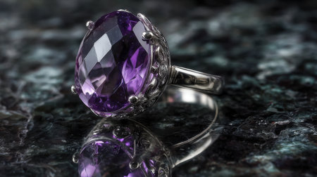 Close-up of an elegant amethyst gemstone ring, showcasing intricate silver craftsmanship and vibrant purple hues, reflected on a dark marble surface.