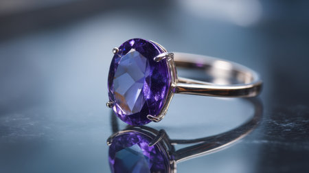 This image showcases a beautiful purple gemstone ring, featuring exquisite facets, reflecting light elegantly on a smooth surface. Perfect for jewelry enthusiasts.