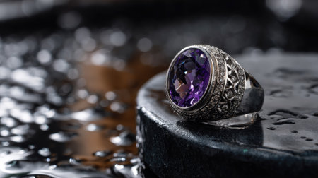 A stunning silver ring featuring a large purple gemstone, elegantly positioned on a wet surface, capturing light reflections and intricate details.