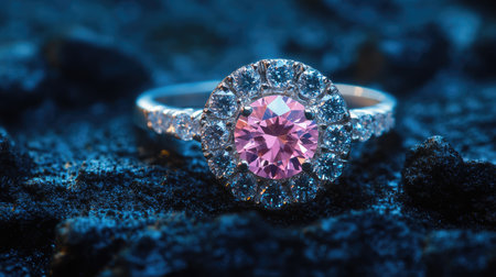 An exquisite pink gemstone ring surrounded by sparkling diamonds, set against a dark textured background, ideal for luxury jewelry showcases.