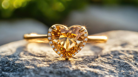 A stunning heart-shaped golden ring featuring a sparkling gemstone perched on a textured stone surface. Ideal for romantic gifts and elegant jewelry displays.