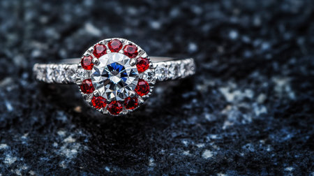 This exquisite engagement ring features a brilliant diamond surrounded by vibrant rubies, showcasing intricate design and stunning craftsmanship against a dark backdrop.