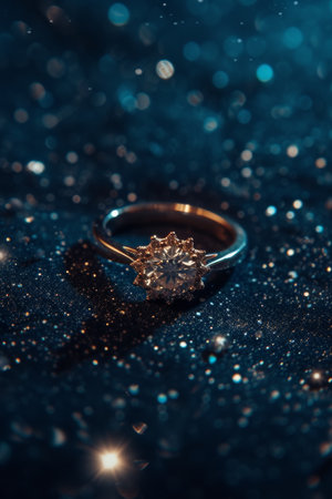 A single engagement ring with a sparkling diamond, set against a blue glittering backdrop evoking magical allure