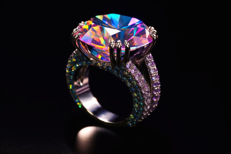 A stunning diamond ring captures attention with its sparkling brilliance against a vibrant rainbow background, showcasing beauty and elegance.