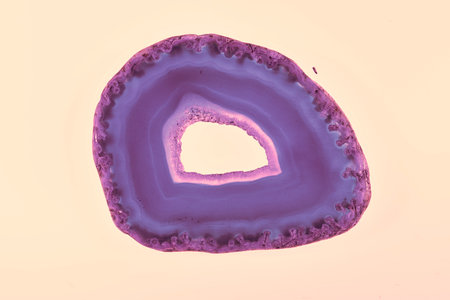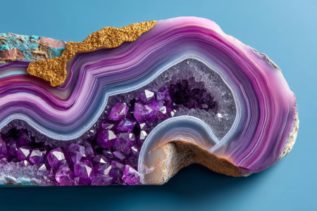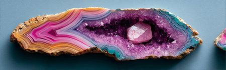 Closeup of sliced semiprecious agate and amethyst geode featuring vivid purple crystal interior and layered bands in pink, yellow, and blue hues. Ideal for luxurious natural designs.