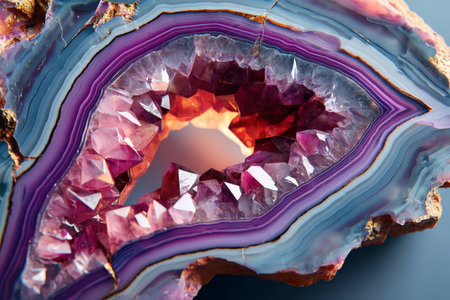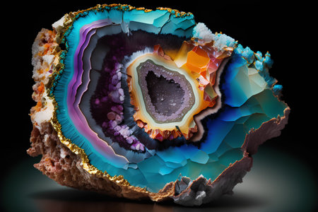 A captivating close-up view of a striking geode showcases its vibrant colors and intricate crystal formations, revealing nature's stunning mineral beauty. Perfect for geological themes.