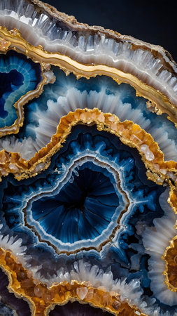 Explore the mesmerizing details of an agate geode in this close-up image. Vibrant layers in blue and orange highlight the natural beauty of this geological wonder.