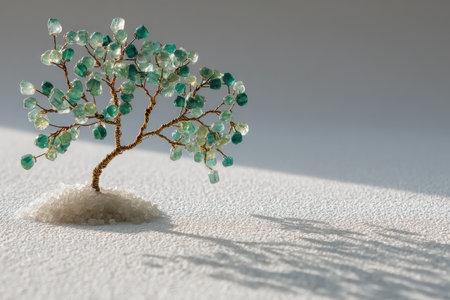 This handcrafted beaded miniature Christmas tree features sparkling green crystals, set against a textured white background, ideal for holiday decor and festive celebrations