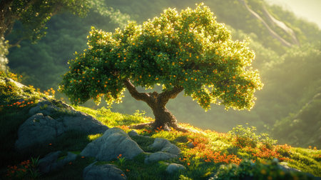 A stunning tree basks in warm sunlight, standing majestically on a hillside filled with lush greenery and blooming flowers, creating a serene nature scene.