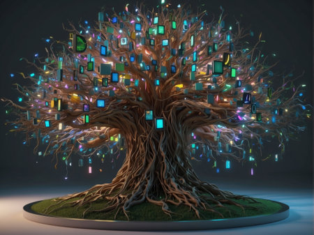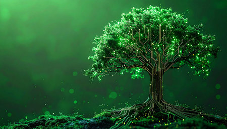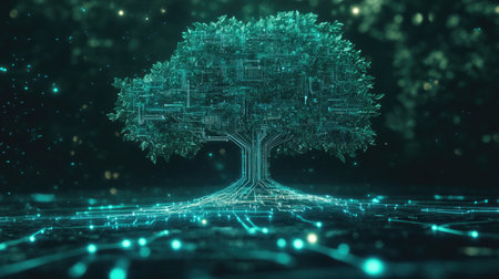 A concept of a digital tree with circuits and leaves intertwined, symbolizing the blend of digital technology with natural growth.
