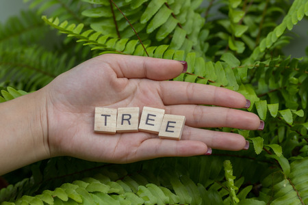 Woman hand holding alphabet tree word with Fern background