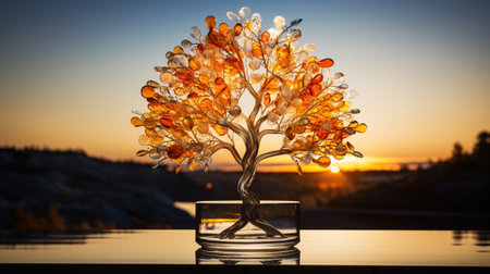 A solitary tree with delicate blossoms reflects sunlight in a serene and ethereal landscape. It represents peace, new beginnings, and the magic of nature.