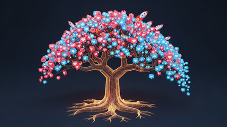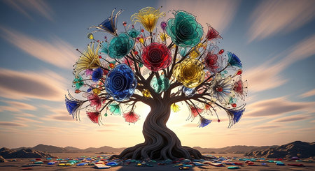 This image depicts an abstract tree with a sturdy trunk and extensive roots. The tree is adorned with vibrant, colorful blossoms in shades of red, pink, and blue. The background is dark, which contrasts sharply with the vivid colors of the tree, making it stand out prominently. The tree appears to be in full bloom, symbolizing growth and vitality.