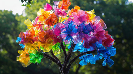 A colorful tree made from discarded plastic bags and wire