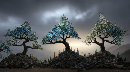 An innovative art installation features vibrant glass trees made from recycled bottles, beautifully arranged on rocky terrain under a dramatic sky.