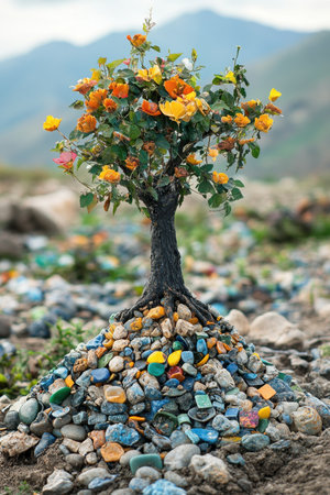 A vibrant tree with bright yellow and orange flowers emerges from a colorful mound of various stones. The scene is set against green hills under a clear sky, showcasing nature's beauty.