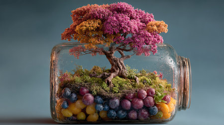 This stunning miniature landscape features a colorful tree surrounded by an assortment of vibrant fruits, showcasing creativity in a glass jar.