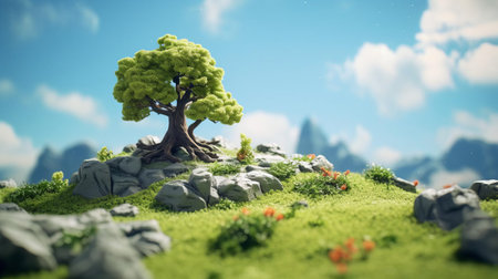 brecknock hill, a whimsical landscape inspired by studio ghibli's fantastical worlds, comes alive in this captivating image featuring a smooth rubber material texture, showcasing a tilt-shift photography effect that adds a sense of miniature wonder, ambient occlusion that enhances depth, and a bright baby cyan background that radiates serenity. ai generated