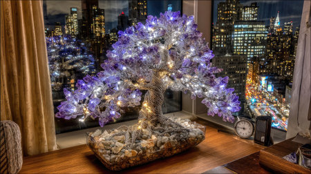 An illuminated decorative tree is the main subject, lit with purple and white lights. It stands on a table with a city skyline visible through a window behind it. The interior features wood and drapery, with a clock. This image could be used for lifestyle, design, and holiday-themed projects.