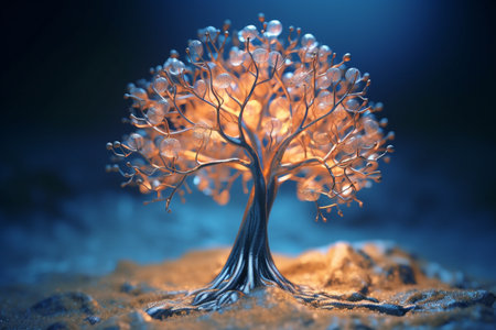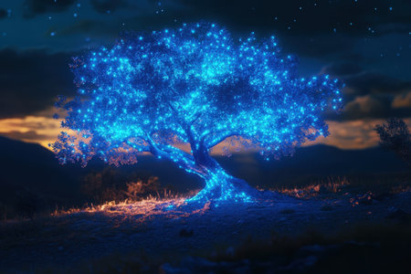 A mesmerizing digital artwork featuring a blue glowing tree with luminous branches and roots, symbolizing growth and connection in a serene nighttime environment.