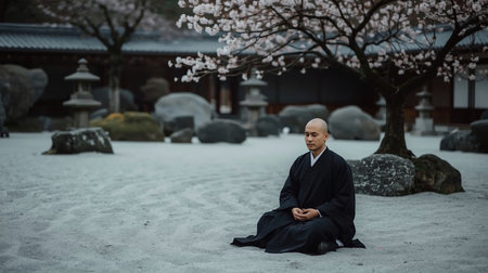 Japanese monk sitting on the sand in front of a blooming cherry tree