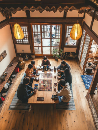 A group of six friends engages in a strategic board game around a low wooden table in a warm and inviting Japanese style interior.