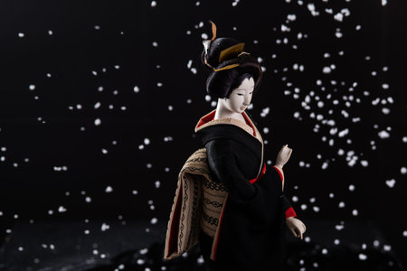 Young japanese woman applying white make up, wearing an elaborate kimono and traditional hair bun, portraying a captivating look of contemplation and tradition