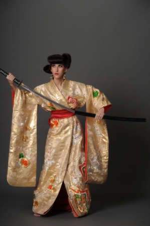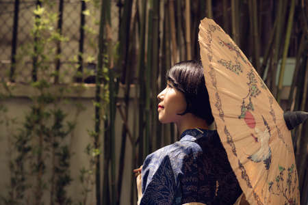 Portrait of beautiful young Japanese woman in traditional costume, copy space